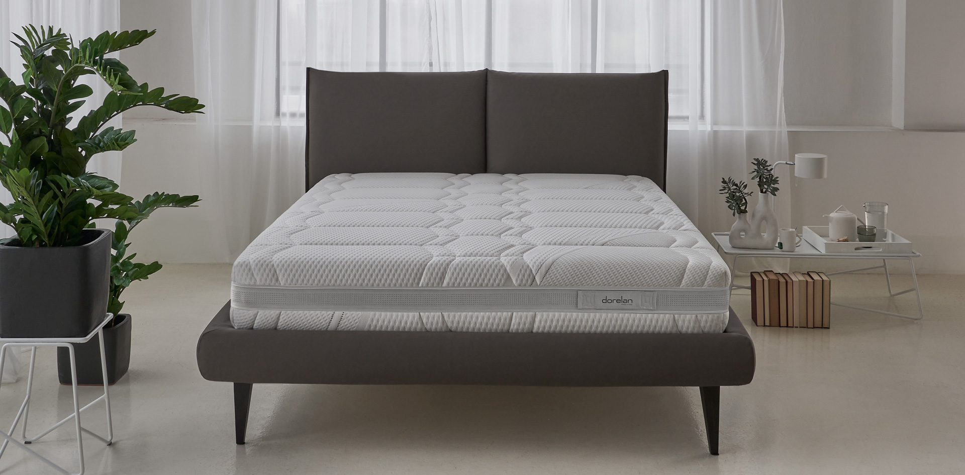 Bastidor de madera de 15×3,5 cm. Acabado roble o tapizado. Lecho con travesaños de madera maciza con núcleo de Foam Support, acolchado en fibra Microclima y tapizado con tejido antideslizante transpirable.